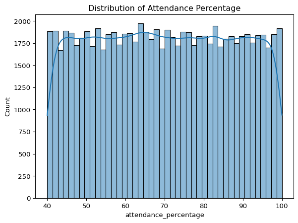 - Attendance is left-skewed: most students attend at least 70% of classes.