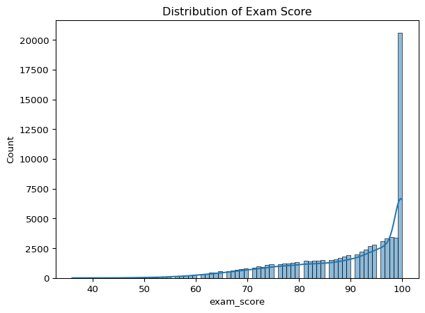 - Exam Score: skewed high, median 93, with many perfect scores (100).