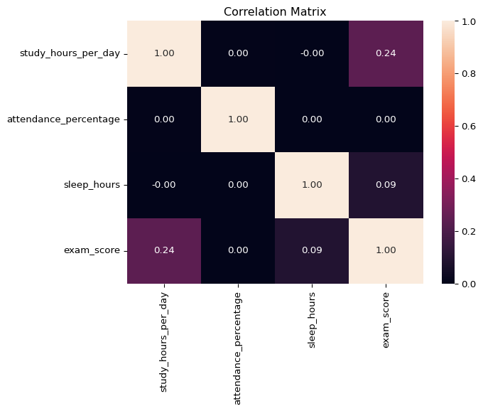 - Sleep Hours & Exam Score: mild positive correlation (~0.20).
